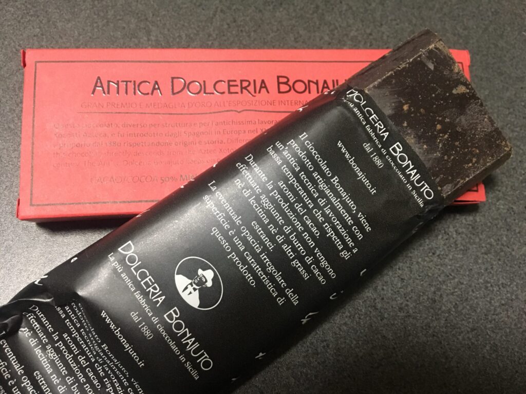モディカにはたくさんのチョコレート屋があります。中でもオススメなのが、モディカで特に人気のある老舗「BONAJUTO(ボナユート)」。バッサのドゥオーモ、サン・ピエトロ教会の近くの路地を入ったところにあります。路地の入口に看板もあるので見つけやすいです。以前は試食も可能でしたが、コロナ禍で中止となりました。今でも中止かどうか正確には分からないので、試食したい場合は店員に尋ねてみてください。