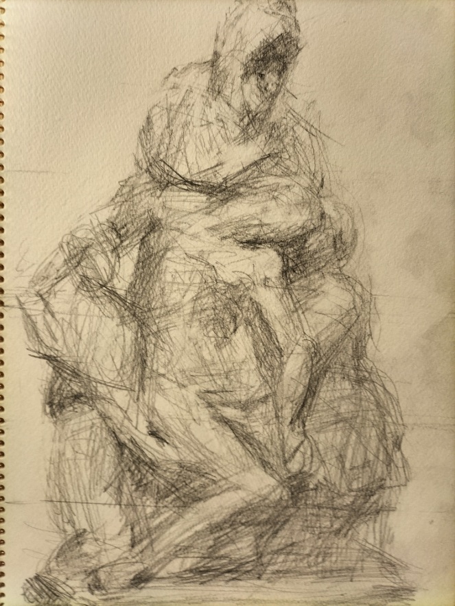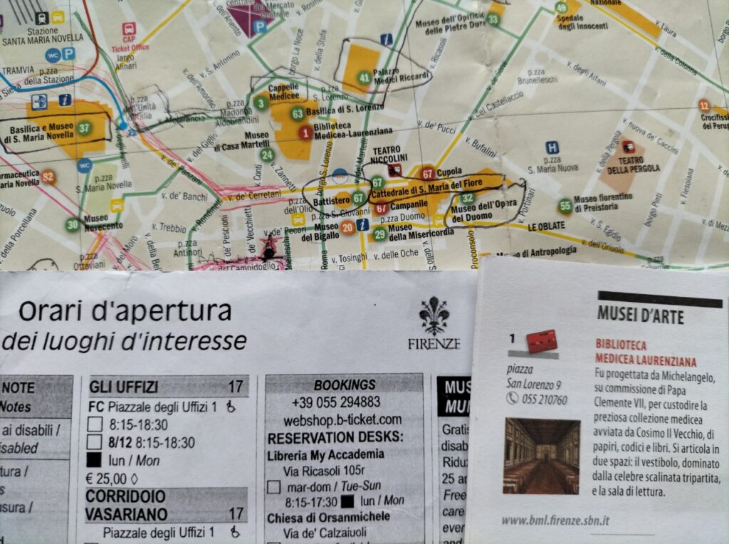 それを頼りに、ウッフィーツィ美術館、サンタマリアノヴェッラ教会、メディチ家礼拝堂、マリノ・マリーニ美術館、ミケランジェロの家、バルジェッロ美術館、サンタクローチェ教会、ブランカッチ礼拝堂、アカデミア美術館を5日かかりですが、車椅子で見学。私も少しだけど描けました。