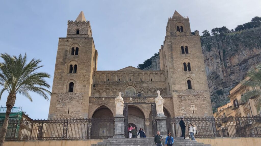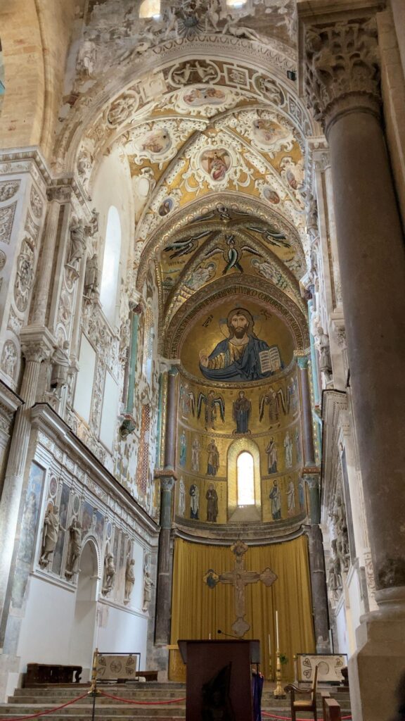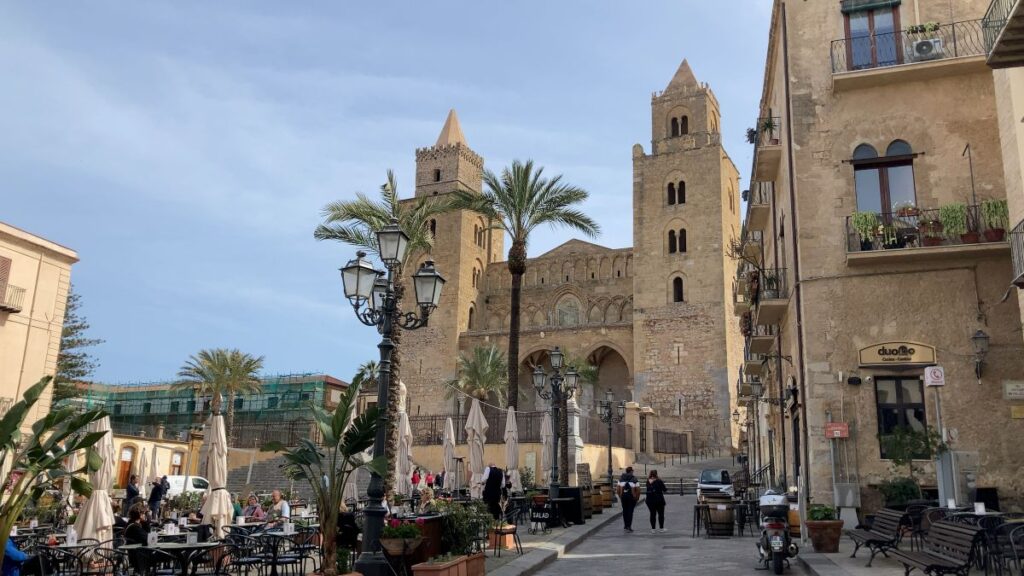 二本の大きな塔に挟まれた壮大な大聖堂。当時シチリアを支配していたノルマン人王ルッジェーロ2世によって12世紀に建立され、内部には金色のモザイク画装飾もあり圧巻です。多くの観光客はこの装飾を一目見ようと訪れます。大聖堂の建つ広場からの風景は絵になるような美しさです。